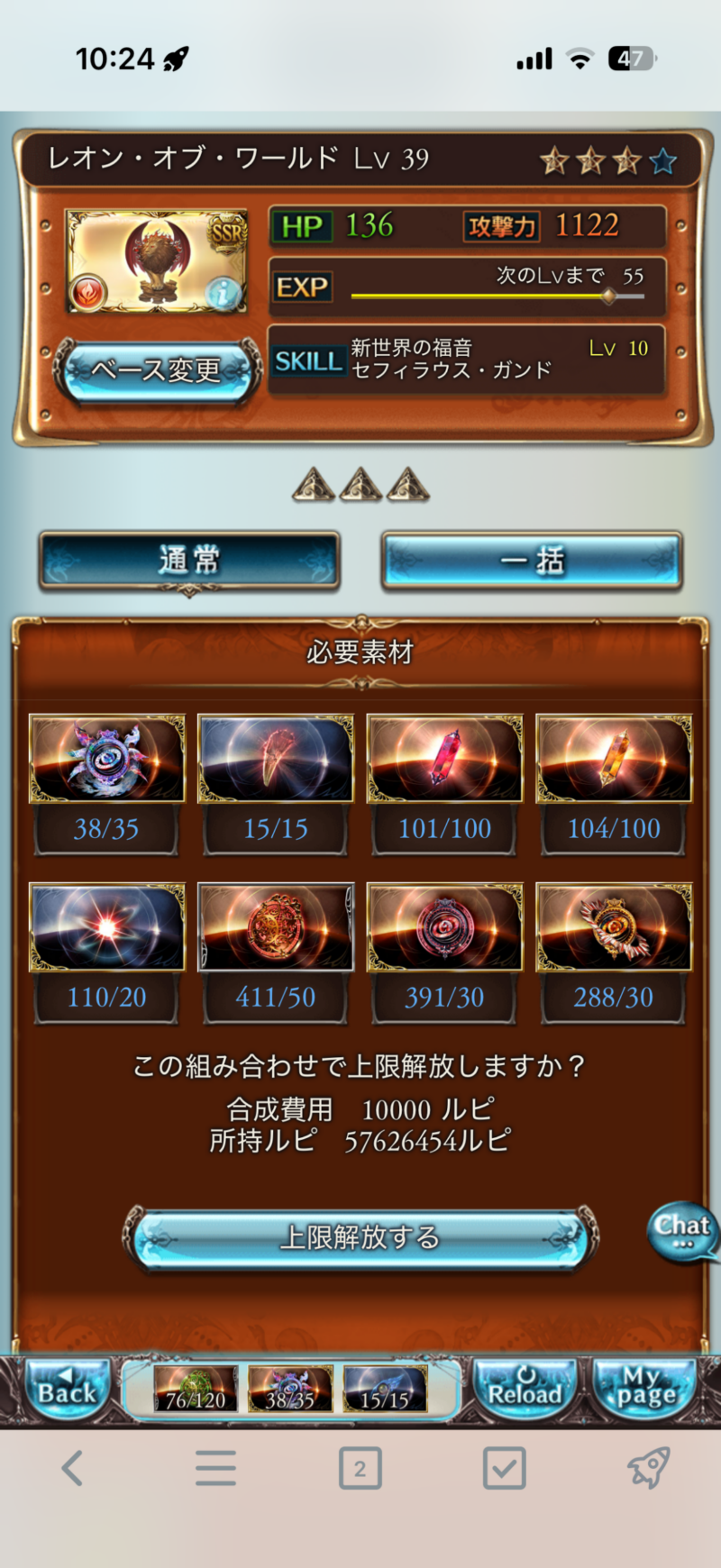 これで必要なトレジャーが全て揃い、無事に上限解放を行いました。